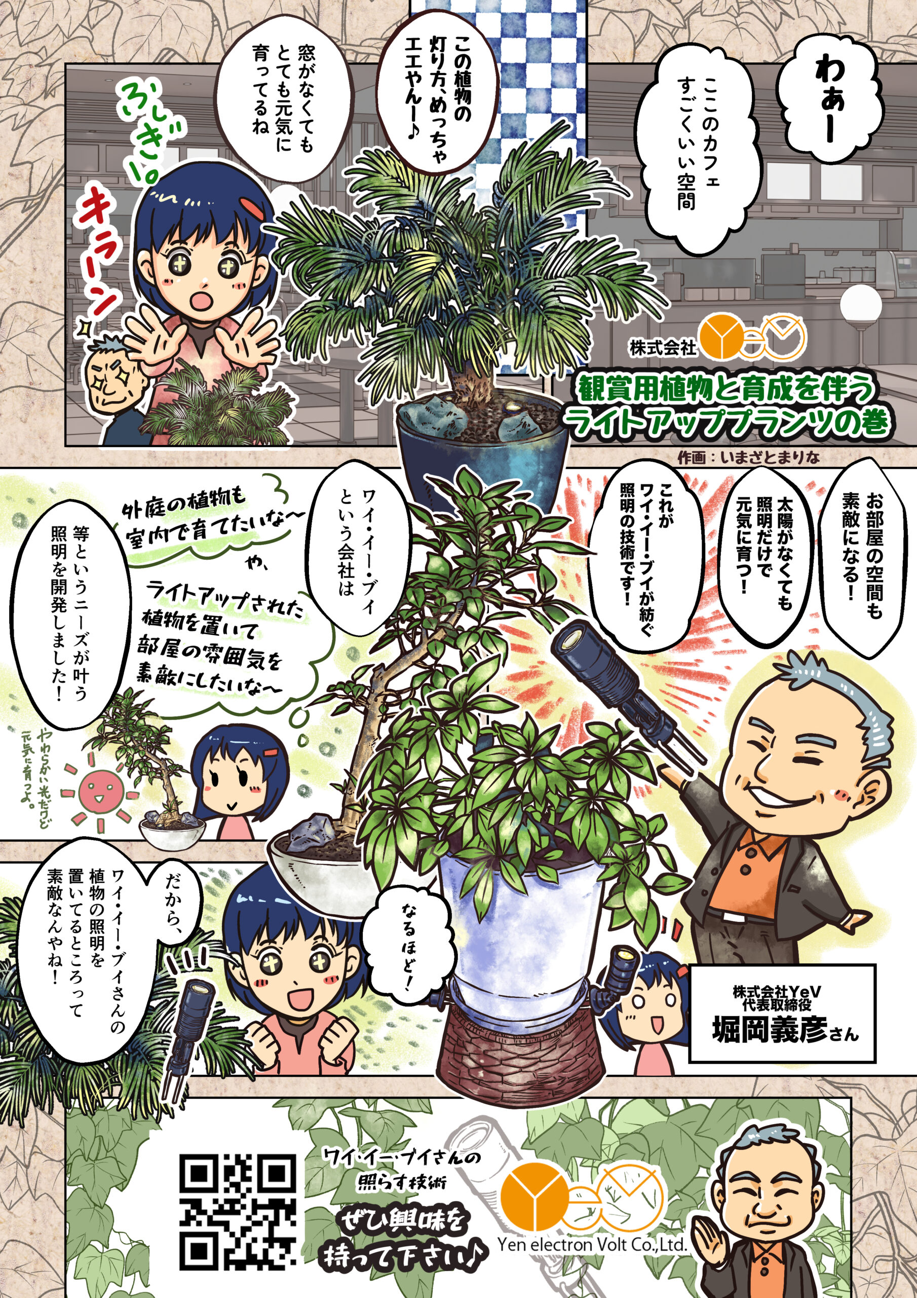 本展は、大阪を拠点に活動するマンガ家と大阪の企業がコラボレーションし、描き下ろしの広告マンガを展示する企画展です。今回、植物と光をテーマに、植物観賞用ライトを題材としたマンガ作品が制作されました。